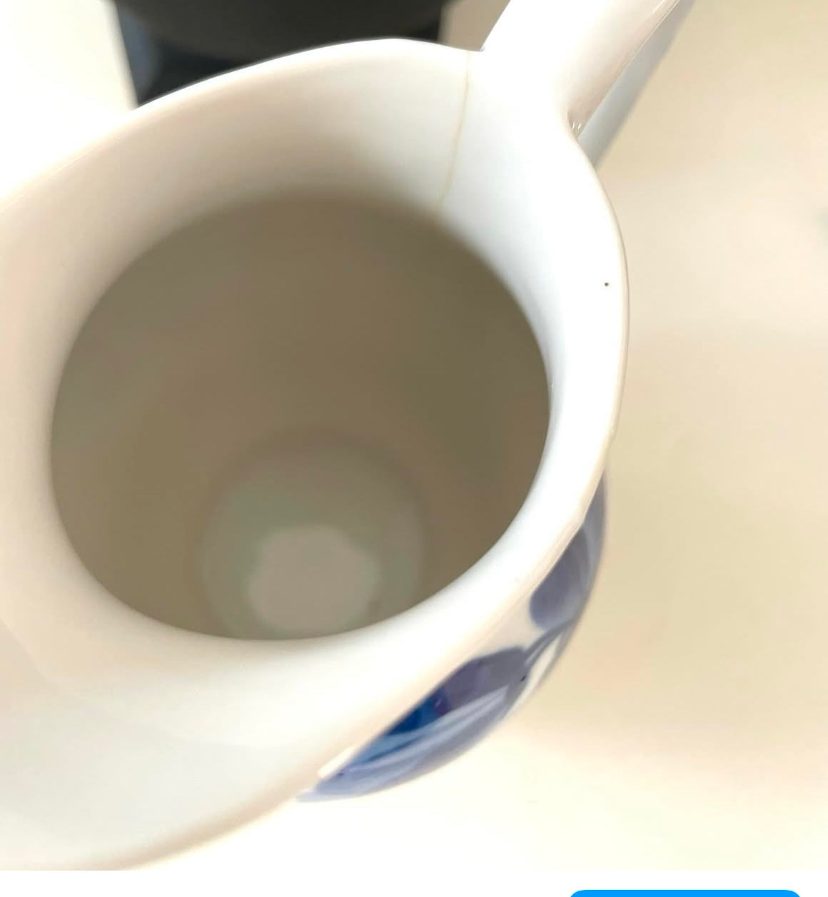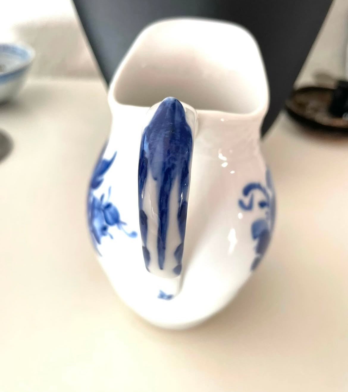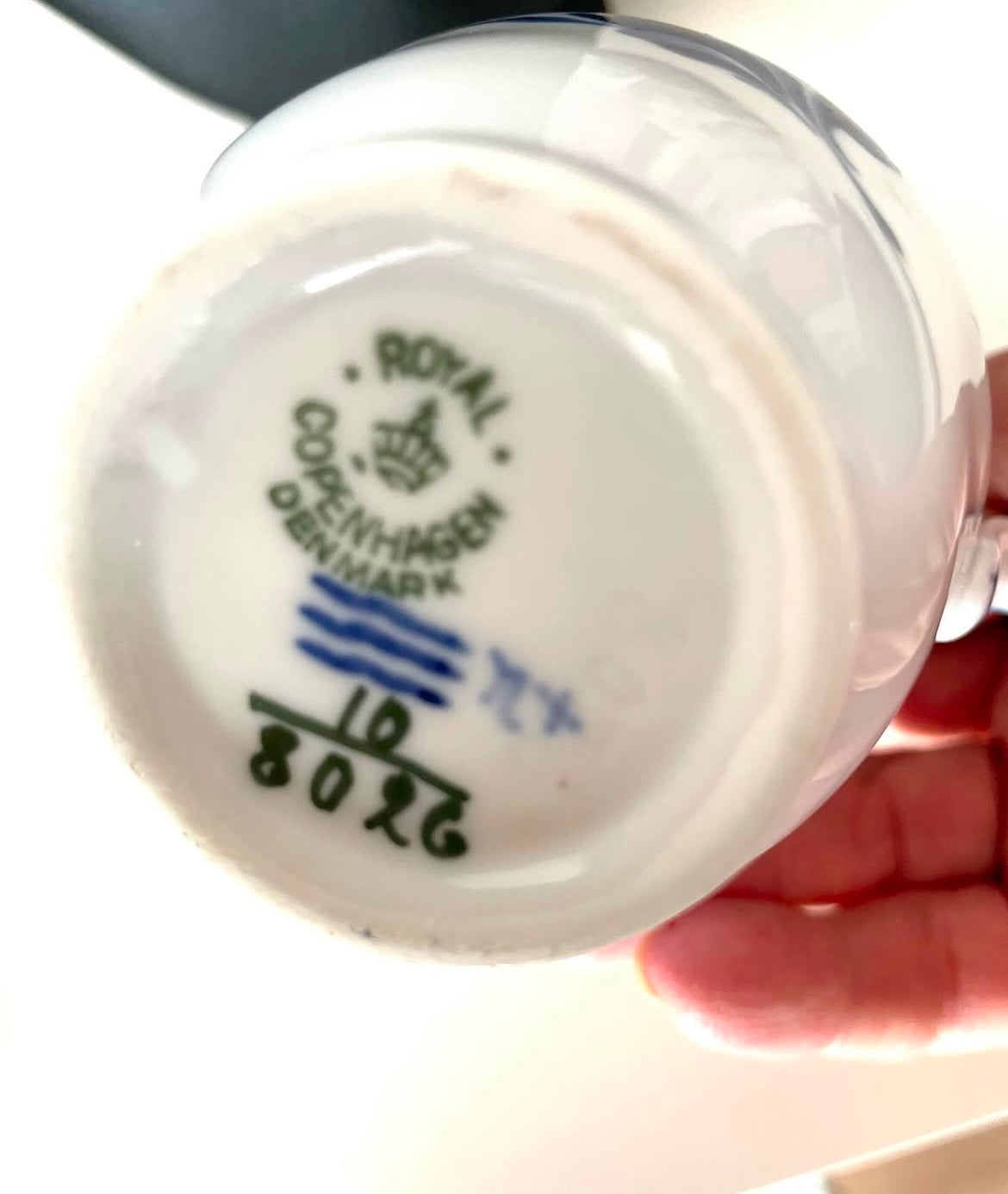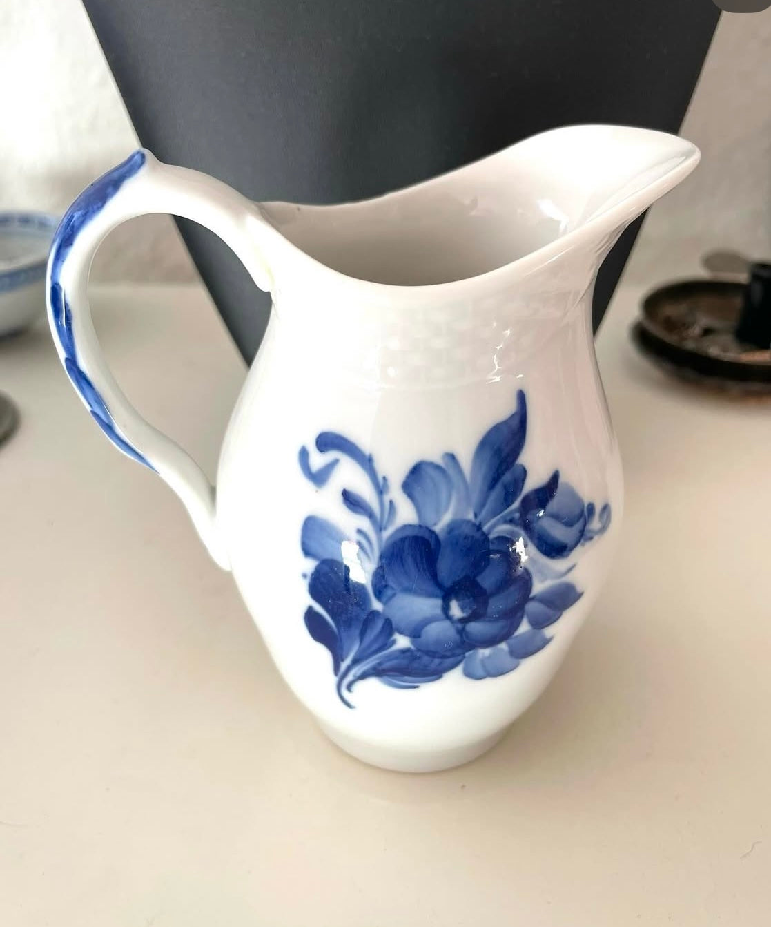 Blå Blomst flødekande med flettet kant, nr. 8026 fra Royal Copenhagen. 1. Sortering uden skår, men hårrevne i glasuren. Indvendig som vist på foto. 12 cm høj. Også yndig som en lille vase.